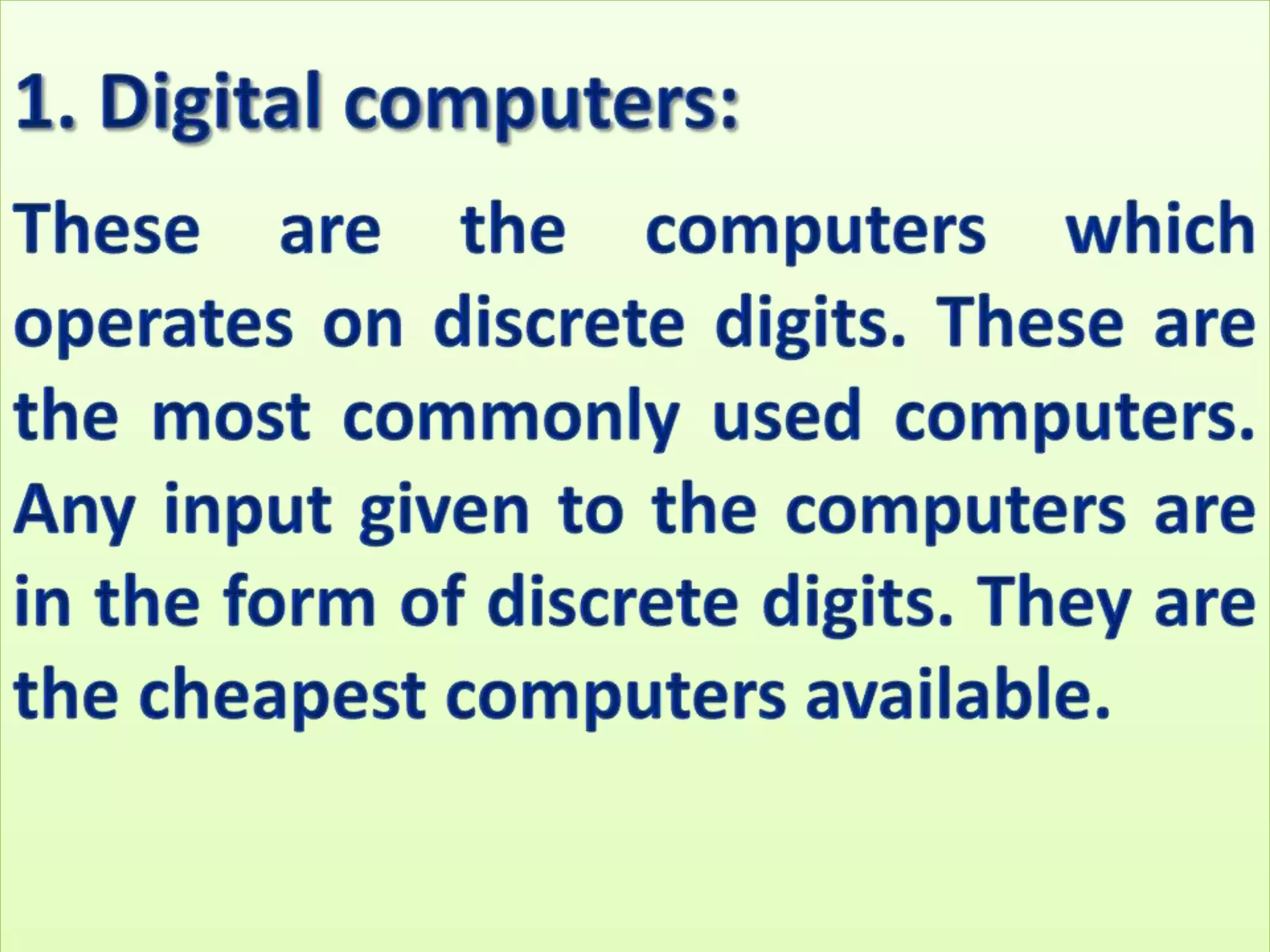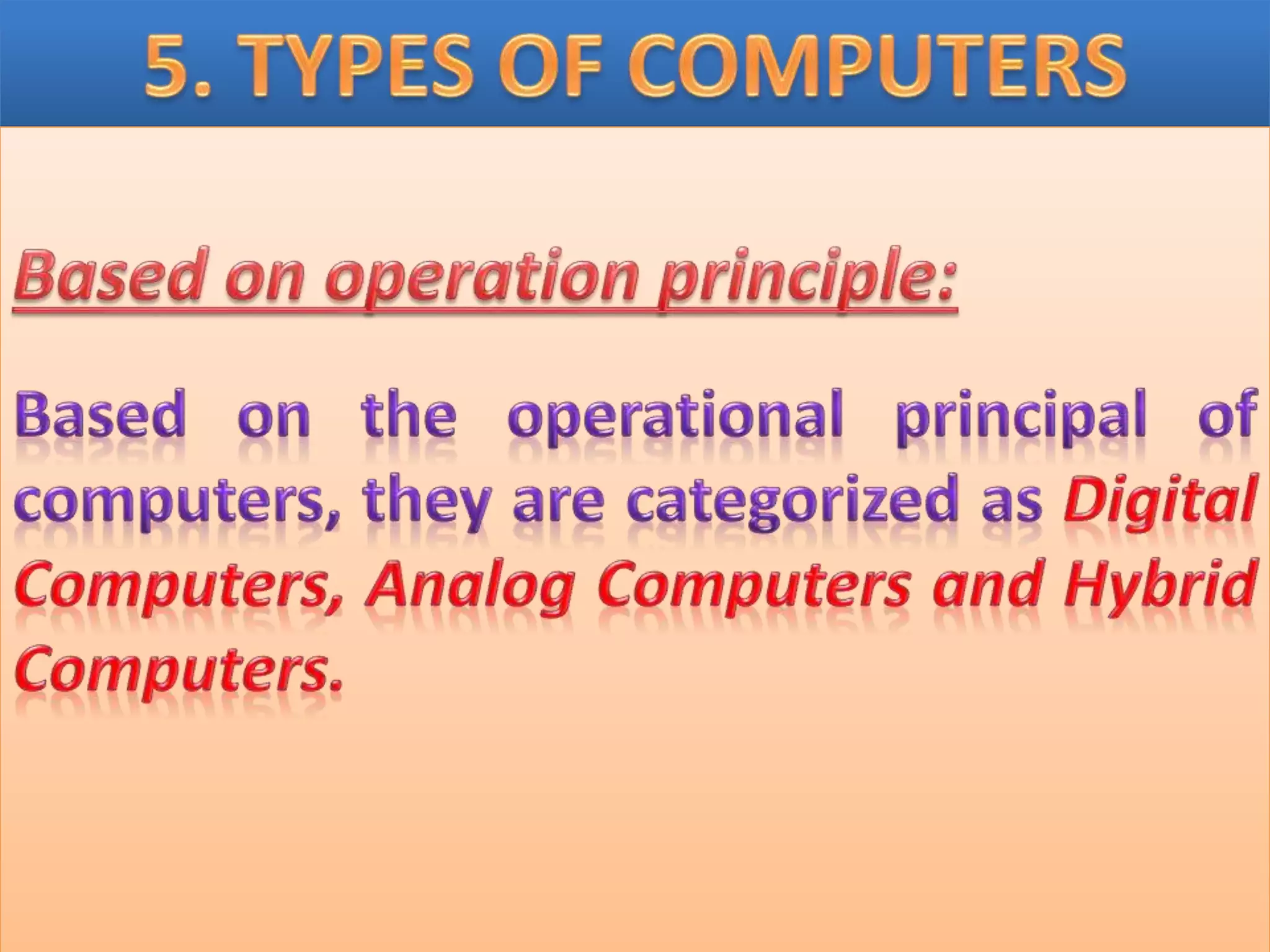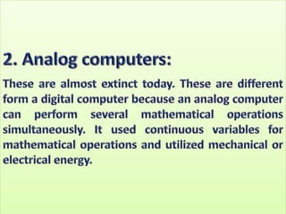 The document discusses the different generations of computers from the 1st to 5th generation. It provides details about the characteristics of each generation including the technologies used and some examples of computers from each generation. The 1st generation used vacuum tubes and magnetic drums. The 2nd generation saw the introduction of transistors replacing vacuum tubes. The 3rd generation brought integrated circuits and operating systems. Personal computers emerged in the 4th generation along with other advances. The 5th generation focuses on parallel processing and artificial intelligence.