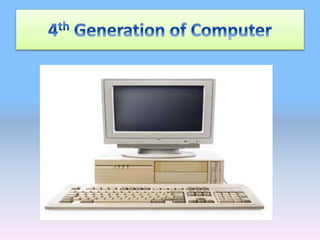 The document summarizes the five generations of computers. The first generation used vacuum tubes and had very low memory capacity. Examples included ENIAC and UNIVAC. The second generation used transistors and had memory up to 1000 MB. Examples were IBM-PC and Marks-I. The third generation used integrated circuits and had memory up to 250 GB, with examples like IBM-PC, HCL, and HP. The fourth generation uses microprocessors with LSI chips and has memory over 1000 GB. Examples are IBM-PC, HCL, HP, and Dell. The fifth generation covers present and future computers.