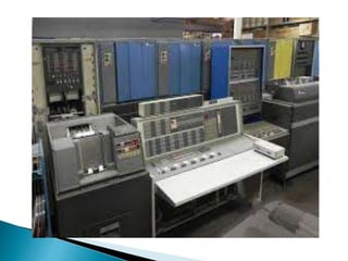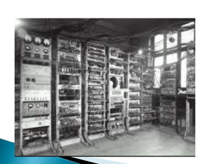 The document discusses the five generations of computers from 1946 to present. Each generation is distinguished by the type of switching circuits used and improvements in size, speed, reliability and capabilities. The first generation used vacuum tubes, the second used transistors, the third used integrated circuits, the fourth used microprocessors, and the fifth aims to develop true artificial intelligence using parallel processing. Each generation saw improvements in performance, cost, and applicability of computers.