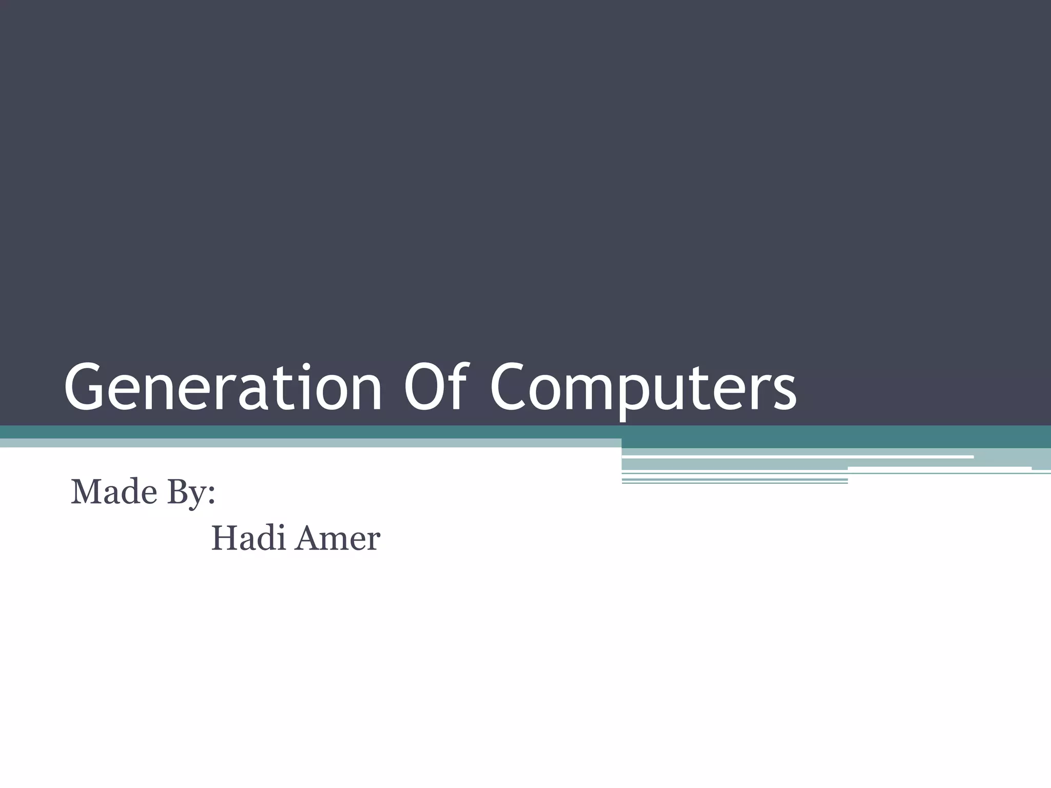 The document outlines the history of computers, divided into five generations, each characterized by significant technological advancements. The five generations include: first generation (vacuum tubes, 1940-56), second generation (transistors, 1956-63), third generation (integrated circuits, 1963-71), fourth generation (microprocessors, 1971-present), and fifth generation (artificial intelligence, present and beyond). Key developments for each generation illustrate the progression in speed, size, and efficiency of computers over time.