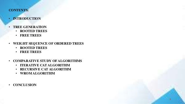 The document discusses the generation of free and rooted trees, detailing various algorithms including the iterative and recursive cat algorithms and the wrom algorithm. It explains concepts like level representation, canonical ordering, and weight sequences, along with the characteristics of unicentroidal and bicentroidal trees. The conclusion emphasizes the effectiveness of the discussed algorithms and their adaptability to specific constraints.