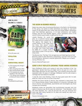 The document discusses trends among different generations, focusing on baby boomers, Generation X, and Generation Y. It highlights how companies are adapting to the preferences of these age groups, such as targeting boomers with social media and products like 'sunny delight'. Additionally, it mentions emerging trends and products aimed at younger generations, including various media and consumer goods.
