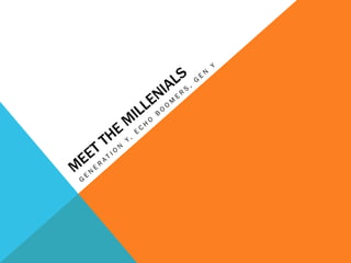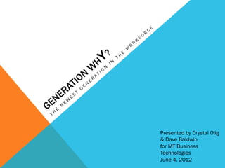 The document discusses strategies for managing Millennial employees, including understanding their preferences around technology, communication styles, feedback, and flexibility in the workplace. It provides insights into generational differences and tips for recruiting, training, motivating, and retaining Gen Y workers. The presenters emphasize the need for managers to adapt their own styles and perspectives to be effective in a multigenerational workforce.