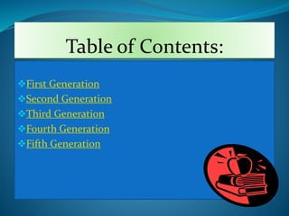 This document summarizes the five generations of computers: 1) First generation used vacuum tubes from 1940-1956 and were large in size. 2) Second generation used transistors from 1956-1963 which made computers smaller, faster, and more efficient. 3) Third generation used integrated circuits from 1964-1971 which used less power. 4) Fourth generation uses microprocessors from 1971-present which are smaller, some fitting in the palm of a hand. 5) Fifth generation uses artificial intelligence from present onwards and tries to simulate human thinking.