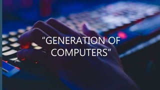 The document discusses the five generations of computers from the first to the present. The first generation used vacuum tubes from 1946-1957 and were large, expensive, unreliable, and generated a lot of heat. The second generation used transistors from 1956-1963, which made computers smaller, faster, and more reliable. The third generation from 1964-1970 used integrated circuits, improving speed and memory while reducing size and cost. The fourth generation from 1971-present used microprocessors and VLSI chips, making computers smaller, more powerful, and affordable with a variety of software. The goal of the ongoing fifth generation is to develop artificial intelligence for natural language understanding and thinking capabilities.