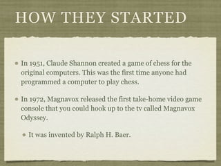 The document traces the history of video games from their origins in the 1950s to modern consoles. It discusses the early computer games created by Claude Shannon in 1951 and the first home console, the Magnavox Odyssey, released in 1972. The document then summarizes the major generations of video game consoles, including the video game crashes of 1977 and 1983, and the rise of popular systems like the Nintendo Entertainment System, Super Nintendo, PlayStation, and modern consoles like the Nintendo Wii, PlayStation 3 and Xbox 360.