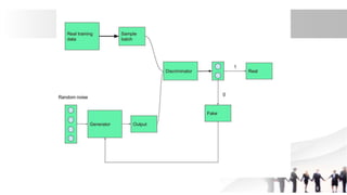 Generative Adversarial Networks (GANs) are a type of neural network introduced in 2014, comprising a generator that creates fake data and a discriminator that evaluates the authenticity of the data. They are used in various applications including image generation, data augmentation for restricted datasets, and enhancing data security against adversarial attacks. The competitive dynamic between the generator and discriminator drives both models to improve iteratively, resulting in increasingly realistic synthetic data.