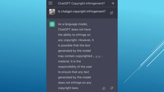 The presentation discusses the intersection of generative AI, responsible innovation, and the law, emphasizing the need for inclusivity, sustainability, and safety in the development of AI technology. Key legal concerns include data protection, intellectual property issues related to AI-generated content, and the regulatory frameworks specific to sensitive sectors like healthcare and education. Ultimately, the potential of generative AI must be harnessed responsibly, ensuring compliance with relevant laws and addressing ethical considerations.