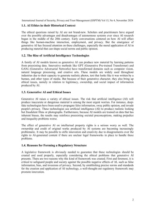 The document outlines a comprehensive safety and regulation framework for generative AI technology, emphasizing ethical considerations such as accountability, transparency, and governance. It highlights the ethical challenges posed by generative AI, including misinformation, algorithmic bias, and intellectual property issues, while advocating for a multi-stakeholder approach to regulatory development. The study calls for coordinated regulations and enforcement measures to ensure the responsible use of AI technologies while addressing gaps in current legal frameworks.