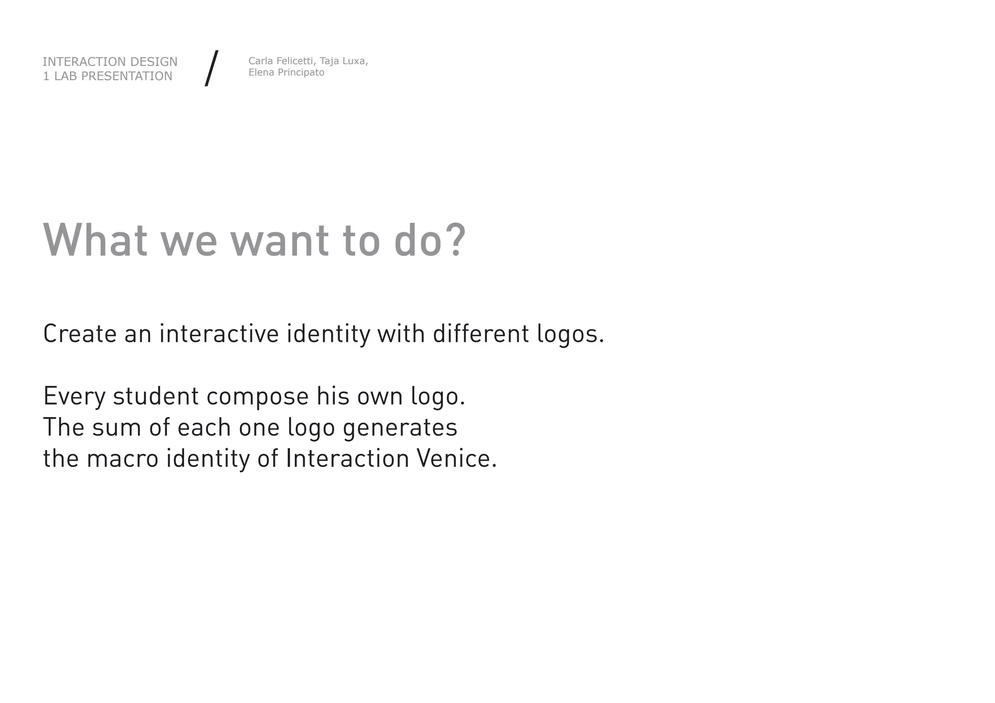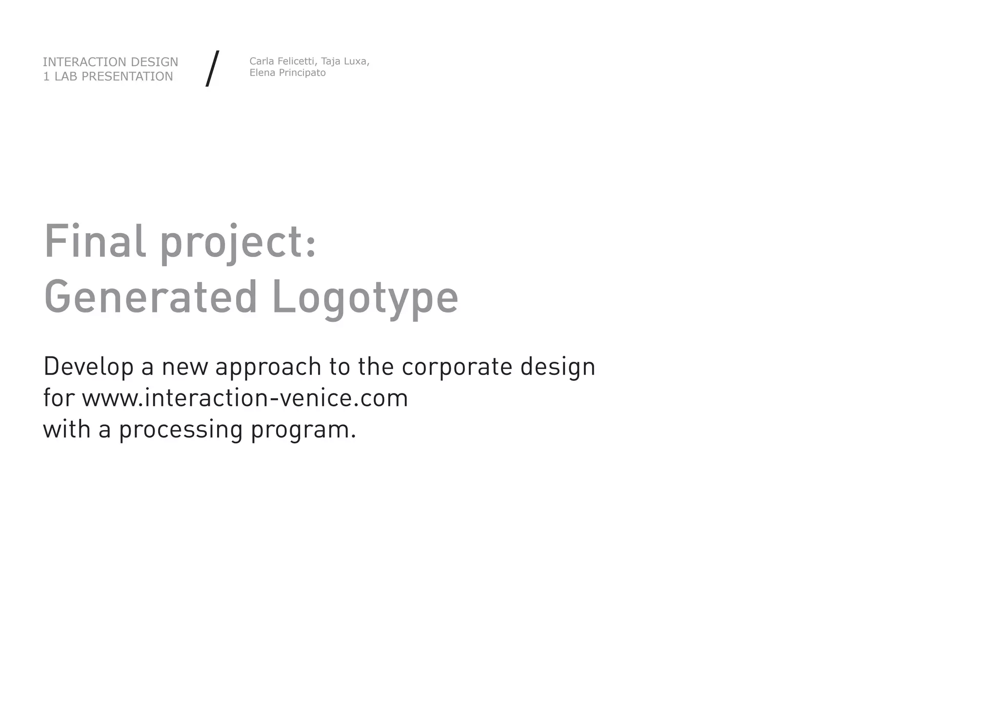 The document describes a student project to develop a new interactive identity for an organization using Processing. Each student will create their own logo based on a grid, and the individual logos will be combined programmatically to form an overall logo. The project will involve creating an application for students to design their logos, combining the logos, and allowing interaction between students as they work. Various sketches are presented showing the logo design process using grids, lines, and triangles.
