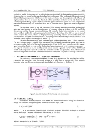 The paper discusses the modeling and control of a wind energy conversion system utilizing a permanent magnet synchronous machine, detailing the roles of a generator, turbine, and power converters. It employs Takagi-Sugeno fuzzy controllers and proportional-integral controllers to maintain voltage and power regulations, showing the simulation's effectiveness in controlling the system. The study highlights advancements in wind turbine technology and the benefits of adopting fuzzy control methodologies to enhance power generation efficiency.