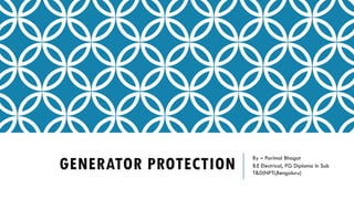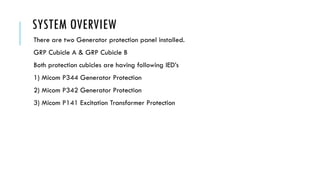 The document details generator protection systems, specifically two protection panels incorporating various MICOM relays for safeguarding against faults and operational risks. It covers a range of protective measures including generator differential, overcurrent, and earth fault protections, along with various relay settings and operational principles. Additionally, it addresses potential risks such as overvoltage, underfrequency, and reverse power conditions, emphasizing the importance of proper relay settings for effective protection.