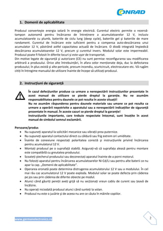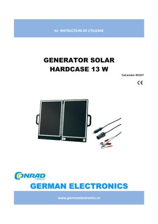 Generatorul solar hardcase de 13 W convertește energia solară în energie electrică, oferind o rezervă de încărcare pentru acumulatoare de 12 V. Este impermeabil, ușor de transportat și nu poate fi modificat, cu instrucțiuni stricte de utilizare pentru siguranță. Utilizatorii trebuie să respecte indicațiile din manual pentru a evita pierderea garanției și riscurile de accident.
