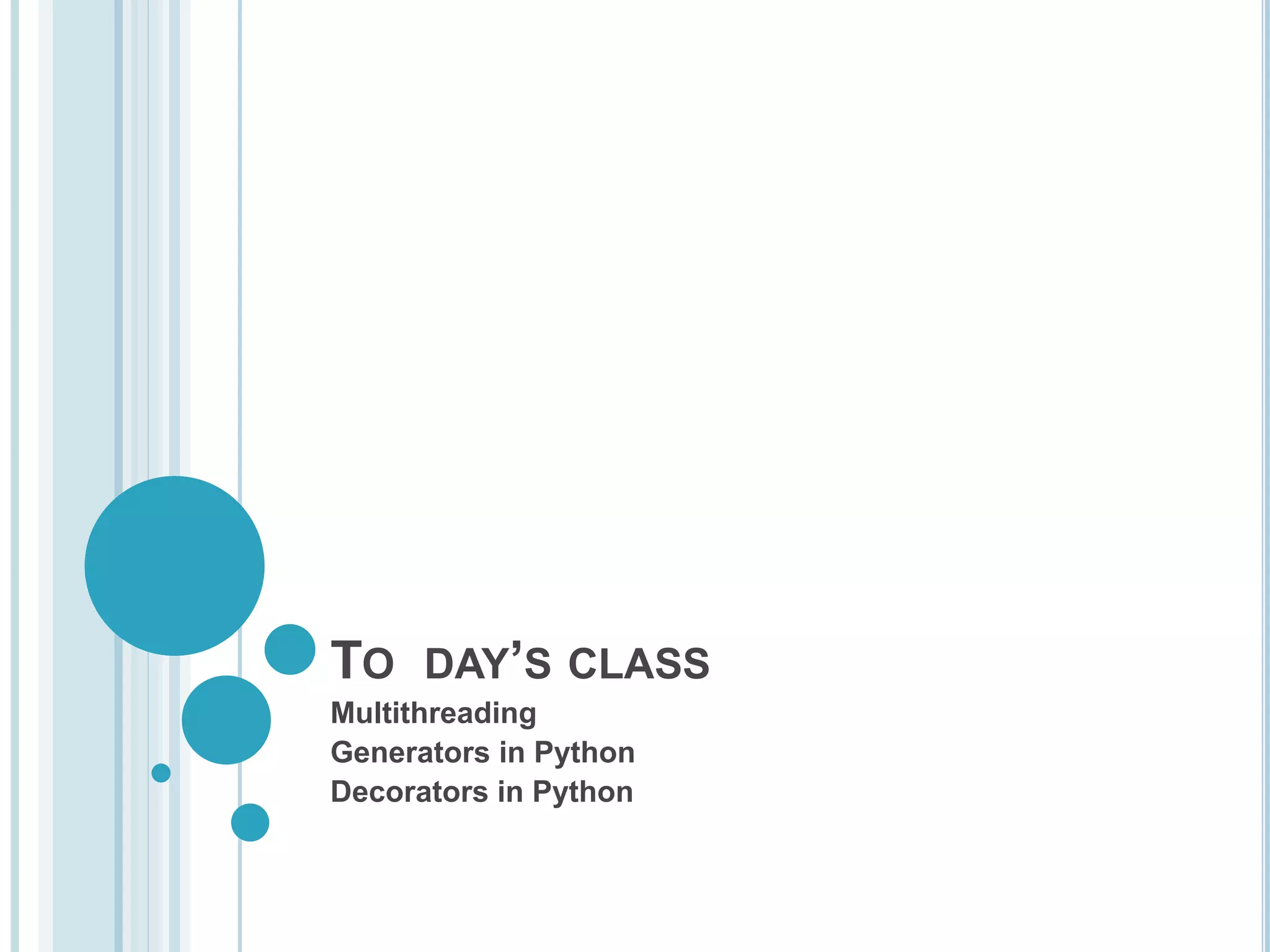 This document discusses multithreading, generators, and decorators in Python. It begins by explaining multithreading and how it allows performing multiple tasks simultaneously through processes and threads. It then provides details on threads in Python, including how to create and use threads. Next, it covers generators in Python by explaining iterators, generator functions, and generator objects. It provides examples of creating generators using both generator functions and generator expressions. Finally, it briefly introduces decorators in Python but does not provide any details.