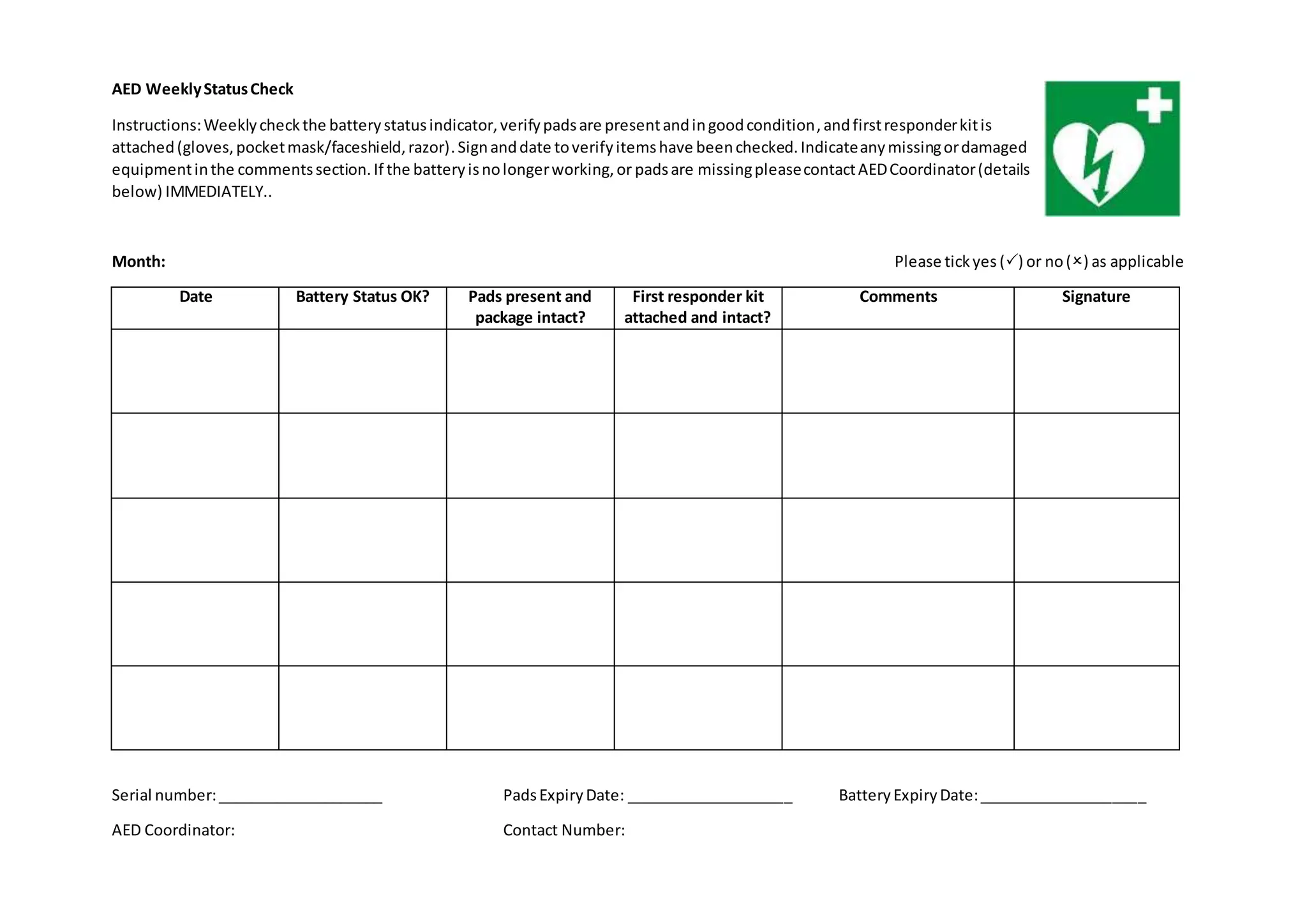 The document provides instructions for weekly checks of an Automated External Defibrillator (AED). It states to check the battery status indicator, verify pads are present and in good condition, and that the first responder kit is attached, which includes gloves, pocket mask/face shield, and razor. Any missing or damaged equipment should be noted in the comments section and the AED Coordinator should be contacted immediately if the battery is no longer working or pads are missing. A table is included to sign and date each weekly check.