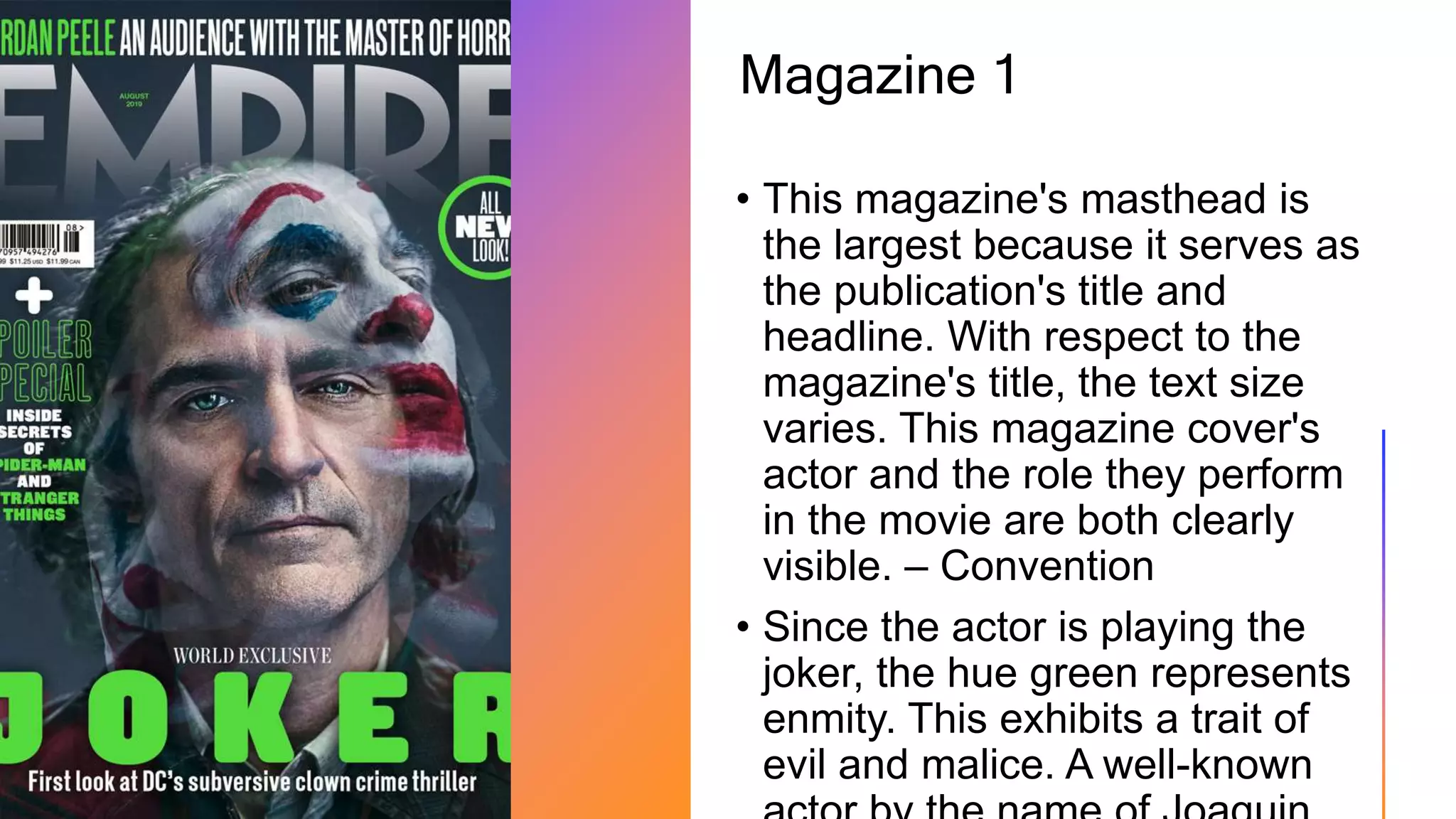 This document discusses conventions used in magazine covers. It analyzes three magazine covers and identifies the conventions used for each. Magazine 1 has the largest masthead to serve as the title and uses varying text sizes. It clearly shows the actor and role. Magazine 2 has a distinct masthead typeface even when actors hide it. The reduced text emphasizes other elements. Magazine 3 varies text size based on significance and uses blue to symbolize the ocean and knowledge.