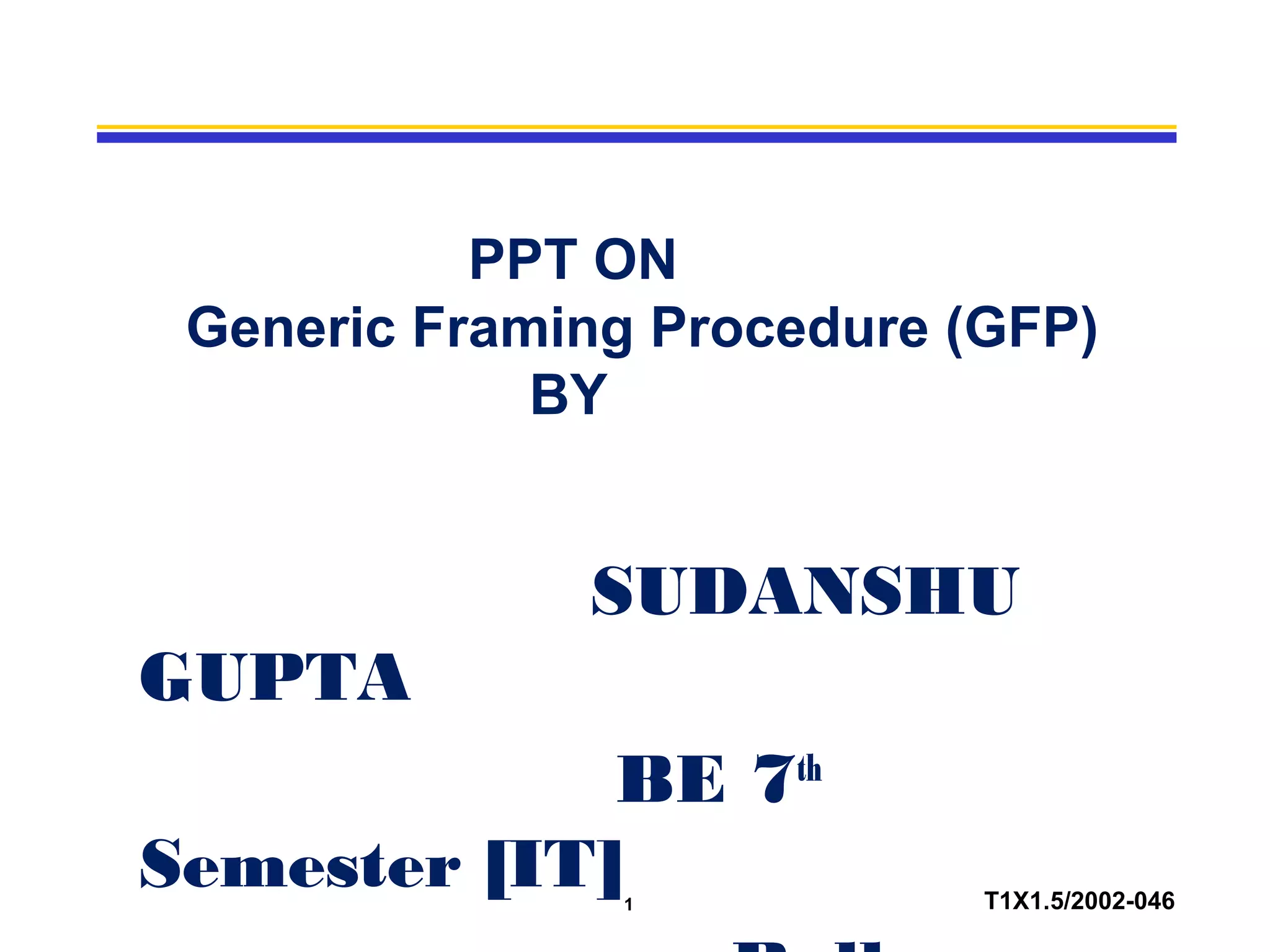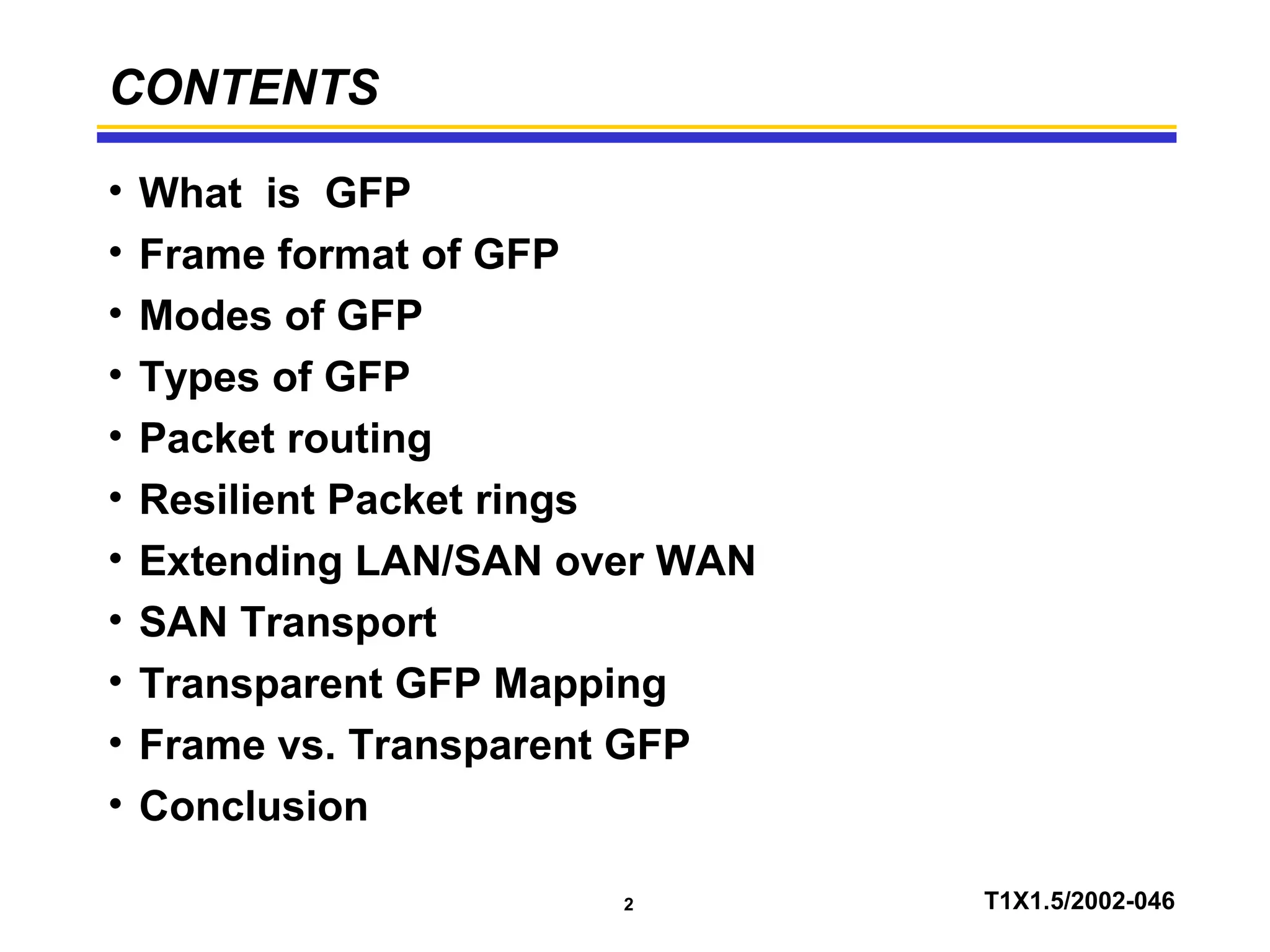 The document provides an overview of the Generic Framing Procedure (GFP) networking standard. It describes GFP's frame format and two modes: framed and transparent. Framed GFP maps each client frame into a GFP frame, while transparent GFP allows mapping multiple client data streams. Applications discussed include packet routing over SONET/SDH links using GFP, resilient packet rings using a ring header, and extending LANs/SANs over WANs using transparent encapsulation.