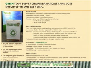 Brandi Priest is presenting on Pallet Wrapz, a reusable mesh wrap for securing pallets that provides several benefits over traditional plastic stretch wrap. It can reduce warehouse accidents, save time and money compared to stretch wrap, and is a more sustainable "green" product. Pallet Wrapz is made of durable, weather-resistant mesh and fastens securely around pallets using straps. It is reusable, recyclable, and provides ventilation to reduce spoilage.