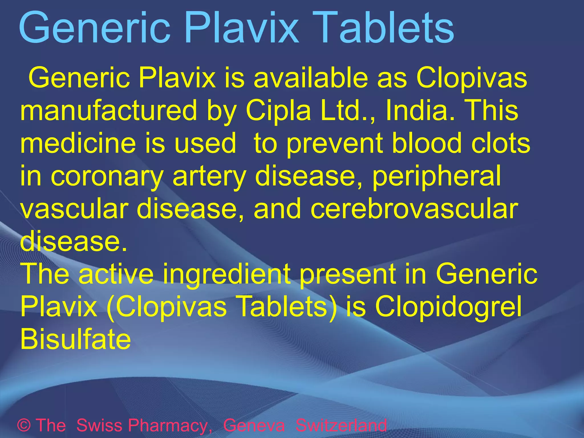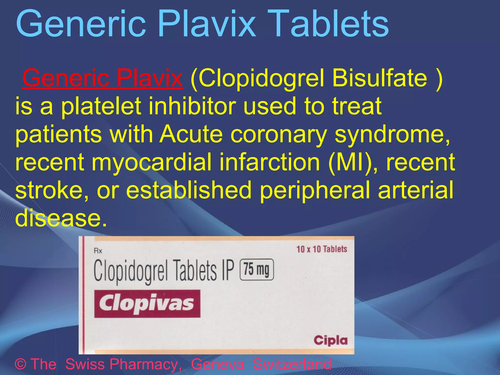 Generic Plavix (Clopivas) contains the active ingredient clopidogrel bisulfate. It is used to prevent blood clots and reduce the risk of heart attack, stroke, or vascular death in patients with acute coronary syndrome, recent heart attack or stroke, or peripheral arterial disease. Common side effects include bleeding, though potentially fatal thrombotic thrombocytopenic purpura has also been reported. It works by inhibiting platelet aggregation and is generally taken long-term at a dose of 75mg daily, with higher loading doses for some conditions.