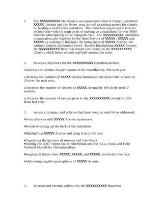 The xxxxxxxxxx marathon aims to promote xxxxx avenue and raise funds for charity by hosting a world-class race, increasing participation and business involvement while boosting awareness of the street. Key objectives include growing participants by 20% annually, involving 20 new businesses, and enhancing charity donations by the same percentage. Strategic considerations involve partnerships with local businesses, effective media outreach, and organizing events to attract visitors and maintain community engagement.