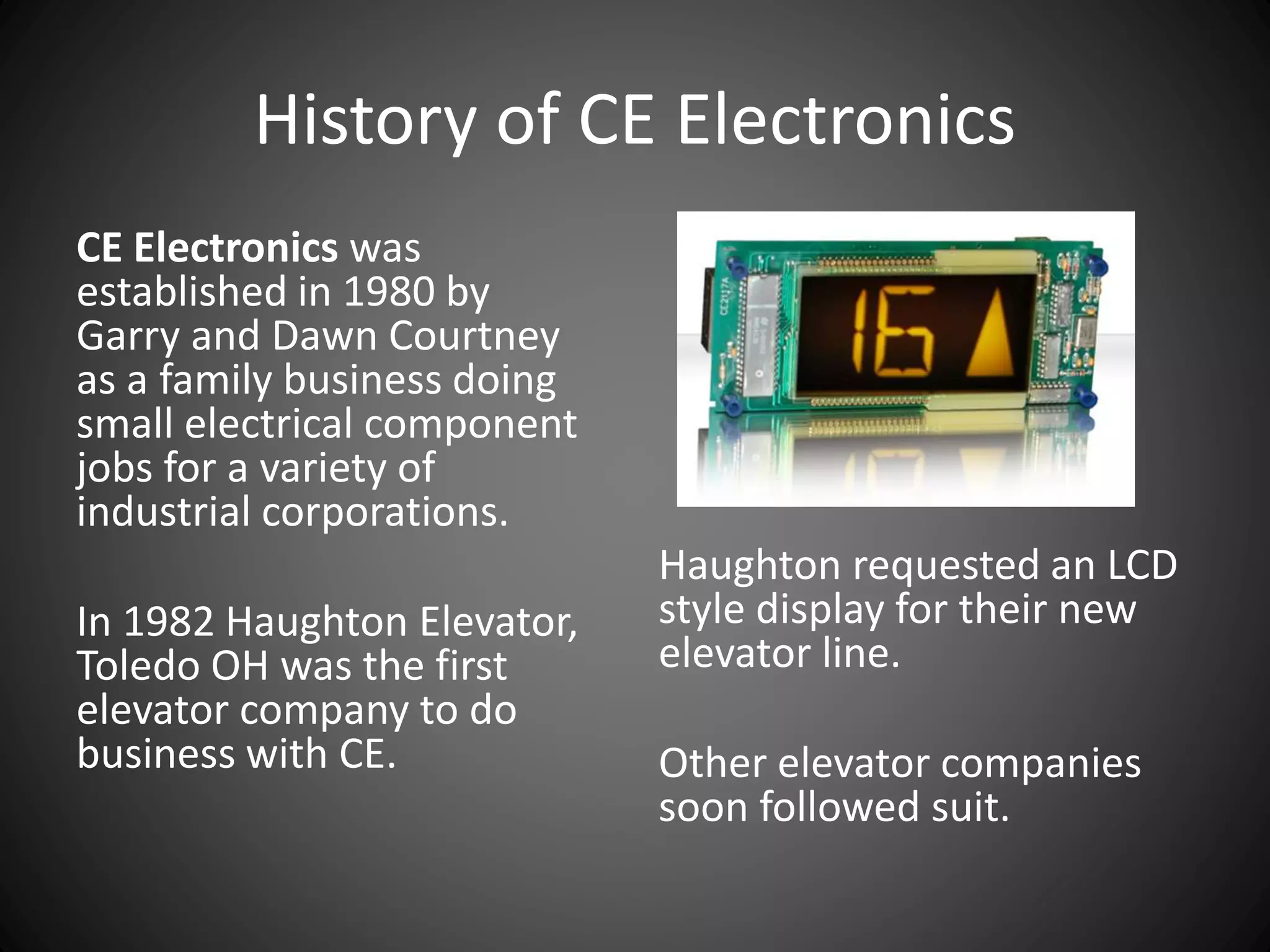 CE Electronics was established in 1980 and initially provided small electrical jobs before partnering with elevator companies to provide LCD displays. It now has over 100 employees and supplies elevator products globally using surface mount technology. CE Electronics leverages new technologies like QR codes, YouTube videos, and touchscreen displays. It also provides services like managed content and subscription-based features for elevator displays.