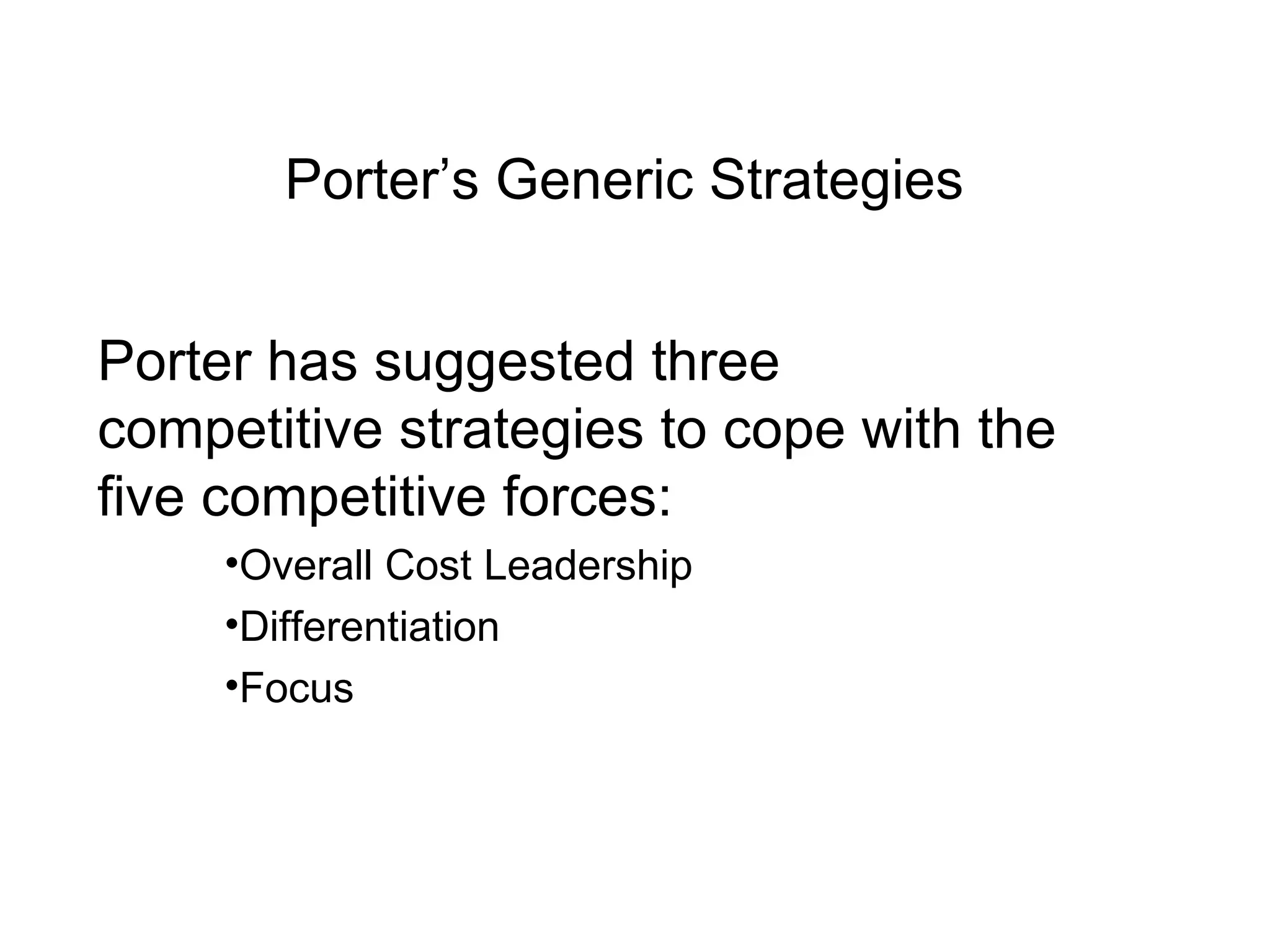 Porter identified three generic competitive strategies: overall cost leadership, differentiation, and focus. Cost leadership involves aggressively lowering costs through efficient facilities, cost reductions, and tight cost control. Differentiation creates a product or service perceived as unique through design, technology, service, or other features, without cost being the primary target. Focus involves targeting a specific customer segment, product line, or geographic market to serve that narrow market more effectively than competitors operating more broadly.