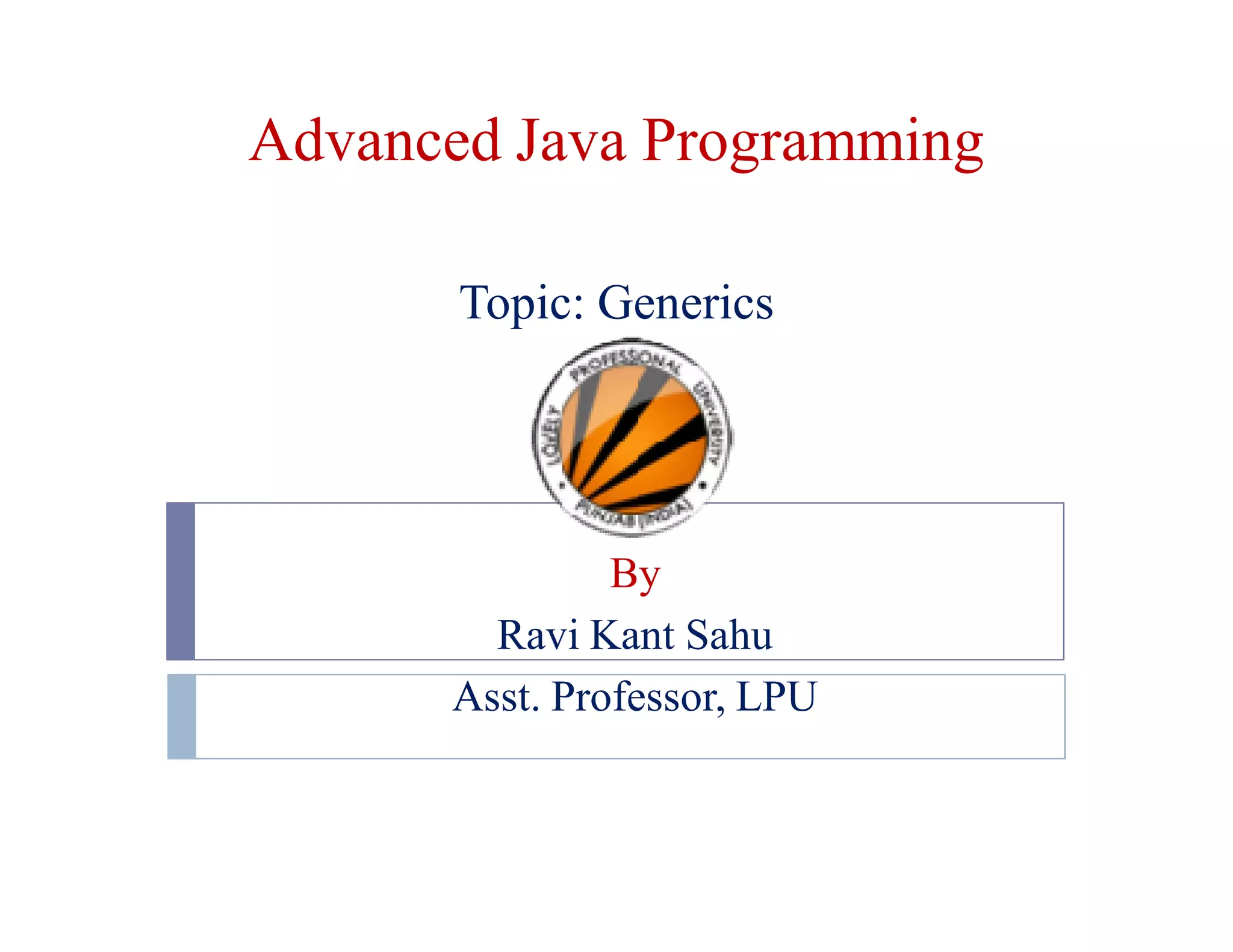 This document provides an overview of generics in Java. It discusses the benefits of generics, including type safety and compile-time error detection. It also covers generic classes and interfaces, generic methods, wildcard types, and restrictions on generics. Examples are provided to illustrate key concepts like generic classes with multiple type parameters, bounded types, and the implementation of generics using type erasure.