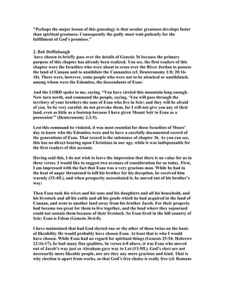 The document discusses Genesis 36, which details Esau's genealogy and raises questions about its significance despite Esau being rejected as the line to the Messiah. It highlights themes of God's faithfulness, contrasts between worldly success and spiritual significance, and emphasizes the importance of spiritual prosperity over material wealth. The chapter serves as a warning against secular greatness and encourages believers to focus on God's promises rather than earthly success.