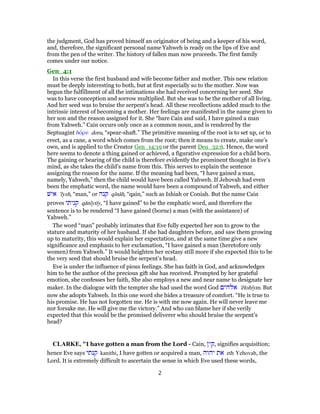 The document provides a commentary on Genesis 4, focusing on the birth of Cain and Abel by Adam and Eve, emphasizing the meanings of their names and Eve's expression of gratitude towards God for her children. It discusses the significance of the names 'Cain' as 'possession' and 'Abel' as 'vanity', reflecting Eve's expectations and experiences as a mother. The commentary also highlights broader themes of divine blessing, human fallibility, and the consequences of sin in the context of family dynamics.