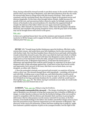 Joseph instructs his steward to fill his brothers' sacks with food and secretly places his silver cup in Benjamin's sack to test their loyalty. After the brothers are accused of theft and must return in distress, Judah pleads for mercy for Benjamin, demonstrating their growth in character. The narrative reveals themes of forgiveness, repentance, and the complexity of familial relationships.