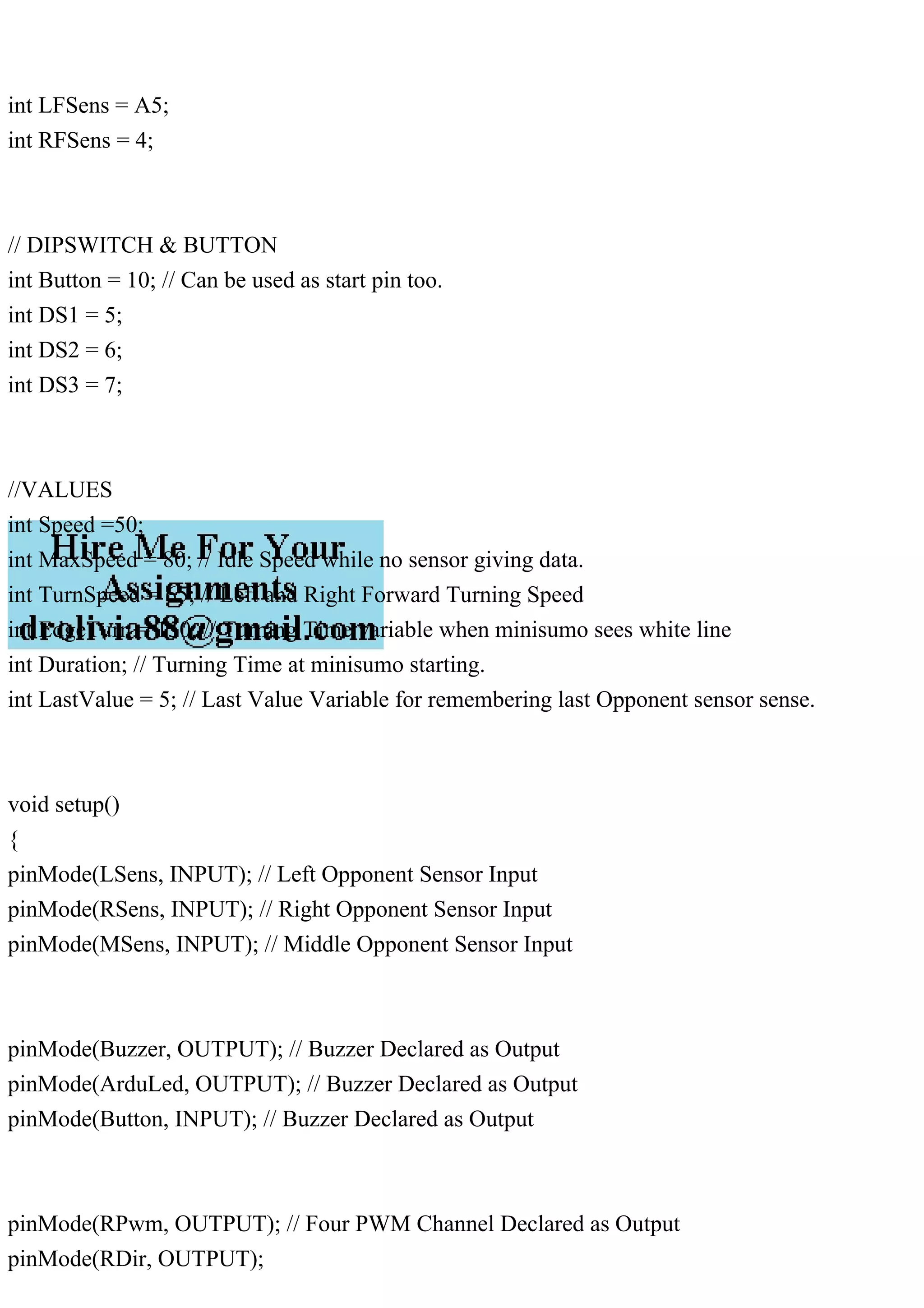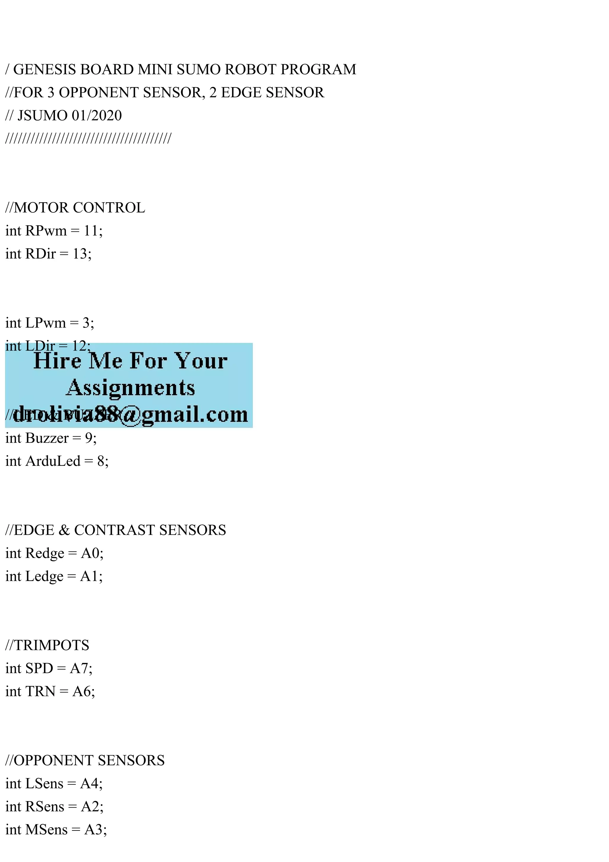 The document contains the complete code for a mini sumo robot programmed to utilize various sensors for movement and obstacle detection. It covers motor control, sensor input handling, and defines the robot's behavior such as making turns and moving forward based on sensor readings. Additionally, it includes a new functionality to follow a square-shaped path through a series of predefined movements.