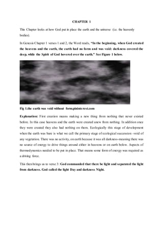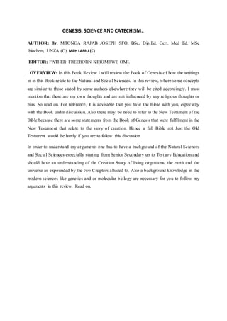 This document is a book review by Br. Mtonga Rajab Joseph that analyzes the Book of Genesis in relation to natural and social sciences. It discusses the creation narrative from Genesis, emphasizing the compatibility of some scientific concepts with biblical teachings, particularly regarding the origins of life and the cosmos. The author presents a perspective that critiques evolutionary theory in favor of a creationist view, asserting that each species was created specifically by God and outlining the implications of this on human existence and ecological responsibility.