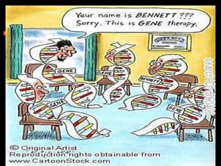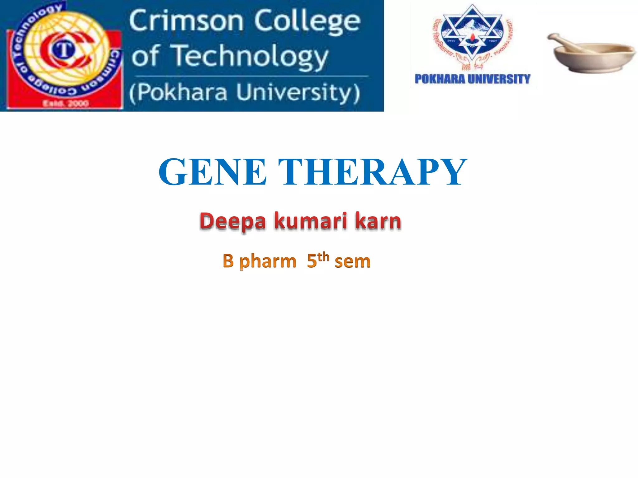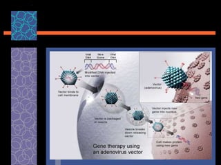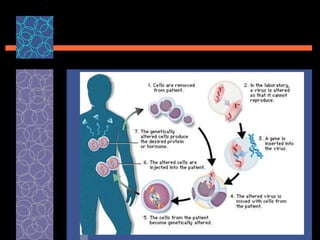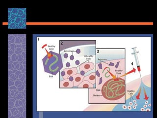 This document provides an overview of gene therapy, including its history, approaches, delivery methods, applications, and challenges. Gene therapy involves introducing a normal gene into cells containing a defective gene in order to correct the underlying genetic disorder. It can be carried out in vivo by using viral vectors to deliver the therapeutic gene directly into patients, or in vitro by manipulating cells outside the body before reintroducing them. Many genetic diseases have been targeted, including immunodeficiencies, cancers, hemoglobinopathies, and rare diseases. While gene therapy holds promise, challenges remain such as short-lived effects, immune responses, and ethical concerns.