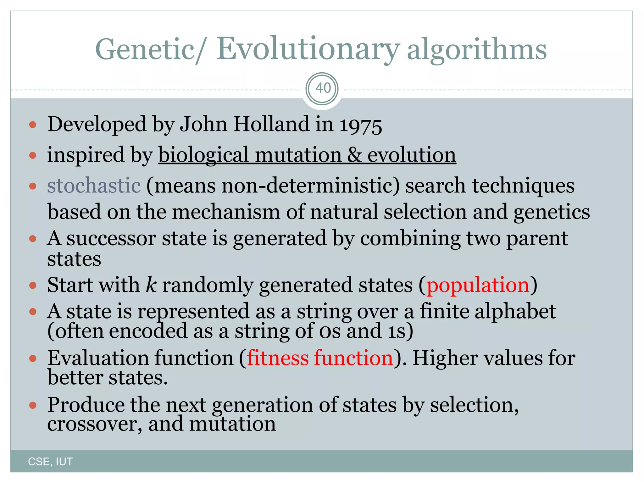 The document describes genetic algorithms, which are inspired by biological evolution. It discusses how genetic algorithms work by starting with a random population that undergoes selection, crossover, and mutation to generate new solutions. The population evolves over multiple generations as higher-fitness solutions are more likely to be selected for reproduction and combination with other solutions. This evolutionary process can help search large problem spaces to find optimal or near-optimal solutions.