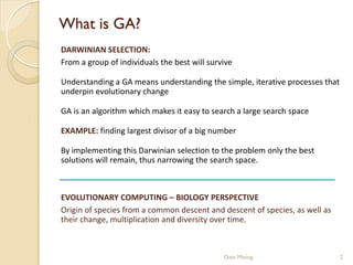 This document provides an introduction to genetic algorithms. It explains that genetic algorithms are inspired by Darwinian evolution and use processes like selection, crossover and mutation to iteratively improve a population of potential solutions. It discusses how genetic algorithms can be used for optimization problems and classification in data mining. Examples of genetic algorithm applications like the traveling salesman problem are also presented to illustrate genetic algorithm concepts and processes.