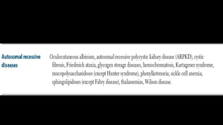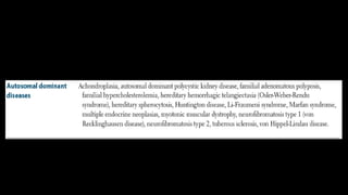 This document discusses the basics of genetics including different modes of inheritance such as autosomal dominant, autosomal recessive, X-linked recessive, and X-linked dominant. It also covers mutations and disorders of chromosomal number, specifically the three types of autosomal trisomies: Down syndrome resulting from trisomy of chromosome 21, Edward syndrome from trisomy of chromosome 18, and Patau syndrome from trisomy of chromosome 13. All other trisomies and monosomies are noted to not be viable.
