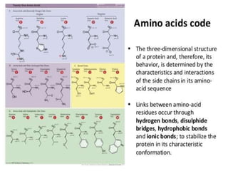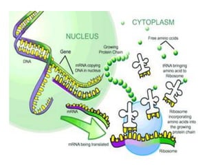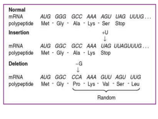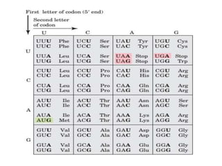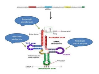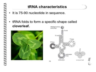 The document discusses the central dogma of molecular biology, detailing the processes of transcription and translation through which genes are expressed as proteins. It explains the role of transfer RNAs (tRNAs), their structure, and the genetic code that governs protein synthesis, including the concepts of codons, wobble pairing, and the history of key discoveries in the field. Additionally, it outlines the effects of mutations on the genetic code, specifically frame shift mutations and base substitutions.