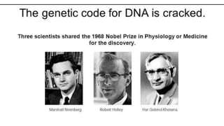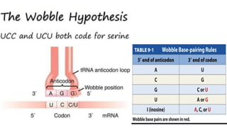 The document outlines the genetic code and the central dogma, detailing how DNA information is transcribed to mRNA and translated into proteins. It discusses codon and anticodon interactions, the characteristics of the genetic code, and the significance of its degeneracy, including the wobble hypothesis. Furthermore, it addresses mutations and their impact on genetic coding and protein synthesis.