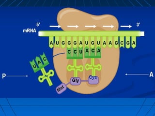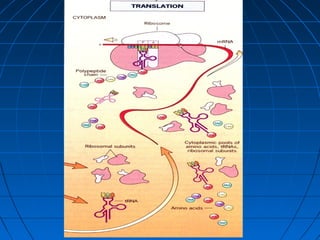 2. Translation is the process by which the sequence of bases in mRNA is used to synthesize a polypeptide chain. It occurs on ribosomes using tRNA molecules to add amino acids specified by mRNA codons.