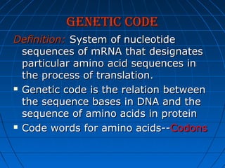 1. The genetic code is the system by which nucleotide sequences in mRNA specify amino acid sequences in proteins during translation. There are 64 possible codon combinations using 3 nucleotides that map to 20 standard amino acids.