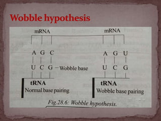 The genetic code is the sequence of nitrogen bases in mRNA that contains the information for protein synthesis. A codon is three nitrogen bases that code for a single amino acid. Nirenberg and Mathaei experimentally proved that codons determine amino acids. The genetic code is universal, uses non-overlapping triplets to specify amino acids in a linear, commaless fashion, and employs initiation and termination codons.