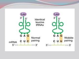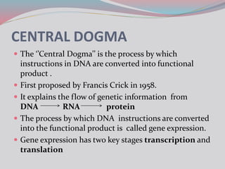 This document provides an overview of the central dogma and genetic code. It discusses how DNA is transcribed into mRNA which is then translated into proteins. The genetic code uses triplets of nucleotides called codons to specify the 20 amino acids. There are 64 possible codons but only 61 encode amino acids, while 3 serve as stop signals. The code is degenerate, universal and read in a consistent direction. The wobble hypothesis explains how one tRNA can recognize multiple codons. Mutations can alter codons and result in silent, missense or nonsense changes impacting protein synthesis.
