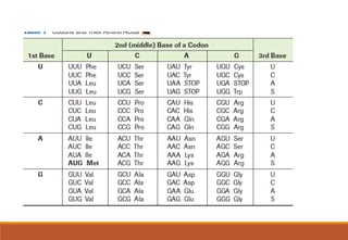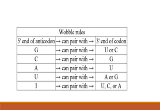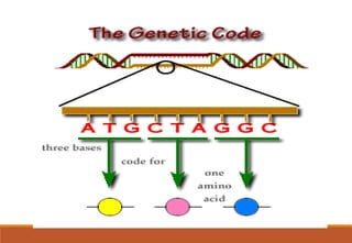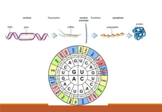 The genetic code is a system that translates nucleotide sequences in DNA and RNA into proteins, consisting of 64 codons made up of three nucleotides each, with 61 codons coding for 20 amino acids and 3 as stop codons. It has characteristics such as being triplet, comma-less, and universal, allowing for degeneration, where multiple codons can code for the same amino acid. The document also discusses mutations that can occur in this code, including silent, missense, nonsense, and frame shift mutations.