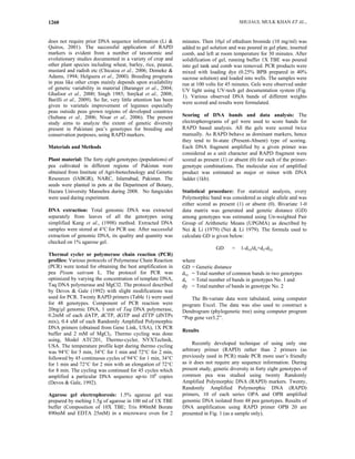 This study assessed genetic diversity in 48 pea genotypes from Pakistan using 20 RAPD DNA markers, revealing significant variations in genetic distance, ranging from 20% to 80%. Phylogenetic analysis grouped the genotypes into three major clusters, suggesting that genetically distinct populations can be identified for breeding purposes. The results emphasize the potential of utilizing molecular markers for enhancing crop breeding and conservation efforts in legumes.