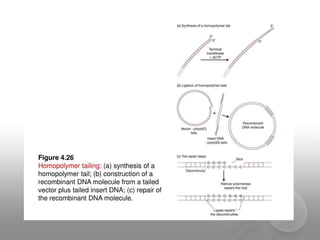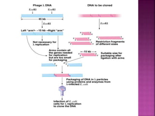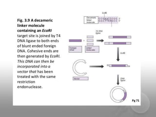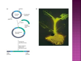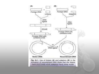 Genetic engineering involves directly manipulating genes, often by adding a gene from another species to an organism's genome. This is done through recombinant DNA (rDNA) technology, which combines DNA sequences artificially. A key part of the process is using restriction enzymes to cut DNA at specific sites, then inserting the cut DNA fragment into a vector like a plasmid for replication in a host cell. The engineered DNA is then introduced into host cells, and cells containing the new DNA are identified and isolated through markers on the vector.
