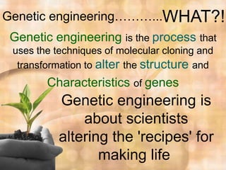 Genetic engineering alters the genes of organisms to produce beneficial effects for humans. It has improved crop yields and introduced traits like disease resistance. Scientists have genetically engineered microorganisms to help clean pollution from soil and water. While genetic engineering provides benefits, there are also risks like unintentionally creating allergenic foods or plants becoming invasive "superweeds". However, regulations aim to minimize these risks and the technology could help nutrition and public health when used carefully.