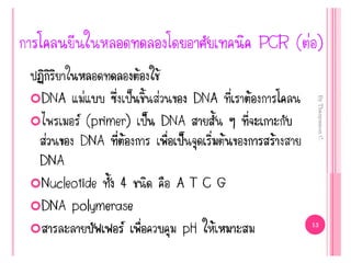 (genome) อาจหมายถึง สารพันธุกรรม หรือกรดนิวคลีอิก ทั้งหมดภายในเซลล์ของสิ่งมีชีวิต ประกอบด้วยจีโนมในนิวเคลียส ไมโทคอนเดรีย และในคลอโรพลาสต์ o จีโนมของสิ่งมีชีวิตชนิดเดียวกัน จะมีลาดับนิวคลีโอไทด์แตกต่างกัน ซึ่งสามารถ ตรวจสอบความแตกต่างนั้นโดยวิธี PCR-restriction fragment length polymorphism (PCR-RFLP) 1. เพิ่มปริมาณ DNA ที่แตกต่างกันด้วยวิธี PCR 2. ตัดด้วยเอนไซม์ตัดจาเพาะ 3. นาชิ้นส่วน DNA ไปคัดแยกขนาดด้วยวิธี gel electrophoresis 4. นารูปแบบของแถบ DNA มาวิเคราะห์