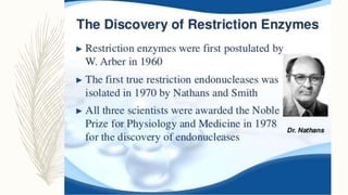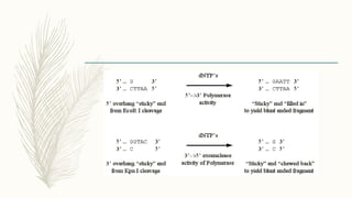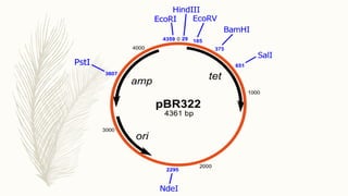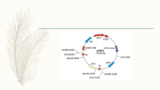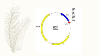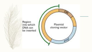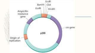 DNA cloning is a technique for reproducing DNA fragments through cell-based methods or polymerase chain reaction (PCR), requiring a vector to carry the DNA into host cells. The process includes cutting the gene of interest, ligating it into a plasmid, and transforming bacterial cells to amplify the DNA, which is selected using antibiotic resistance. Cloning vectors have specific properties to facilitate DNA transport and selection, with various types suited for different cloning experiments, including plasmids, cosmids, and retroviral vectors.