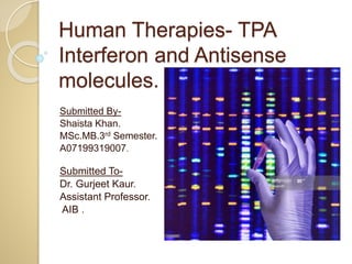 This document discusses different human therapies including Tissue Plasminogen Activator (tPA), Interferons, and Antisense molecules. It provides details on tPA such as its function in catalyzing the conversion of plasminogen to plasmin to dissolve blood clots. It describes the three types of Interferons, their roles in the immune response against viruses, and how viruses can develop resistance against Interferons. It also defines the main classes of Antisense molecules that inhibit target RNA functions through complementary base pairing, including their advantages and applications in reducing expression of disease-associated proteins.