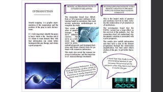 This document summarizes two genetic studies on cancer. The first study mapped genetic mutations in cutaneous melanoma and identified four subtypes. It also found a protein related to immune response that is overexpressed in melanoma cells. The second study linked a genetic variation in the FOPNL gene to poorer survival rates in multiple myeloma patients, but the mechanism is still unknown. Both studies help locate genes of interest and their variations in diseases, which can inform targeted cancer therapies and improve patient outcomes.